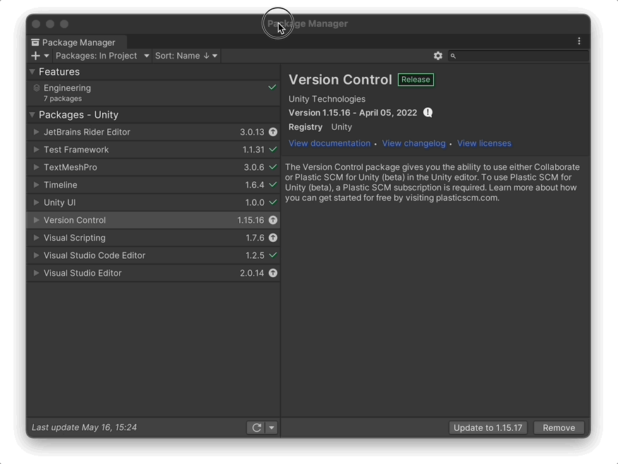 1. In the header tab, select `Window > Package Manager` to open the Package Manager window.\