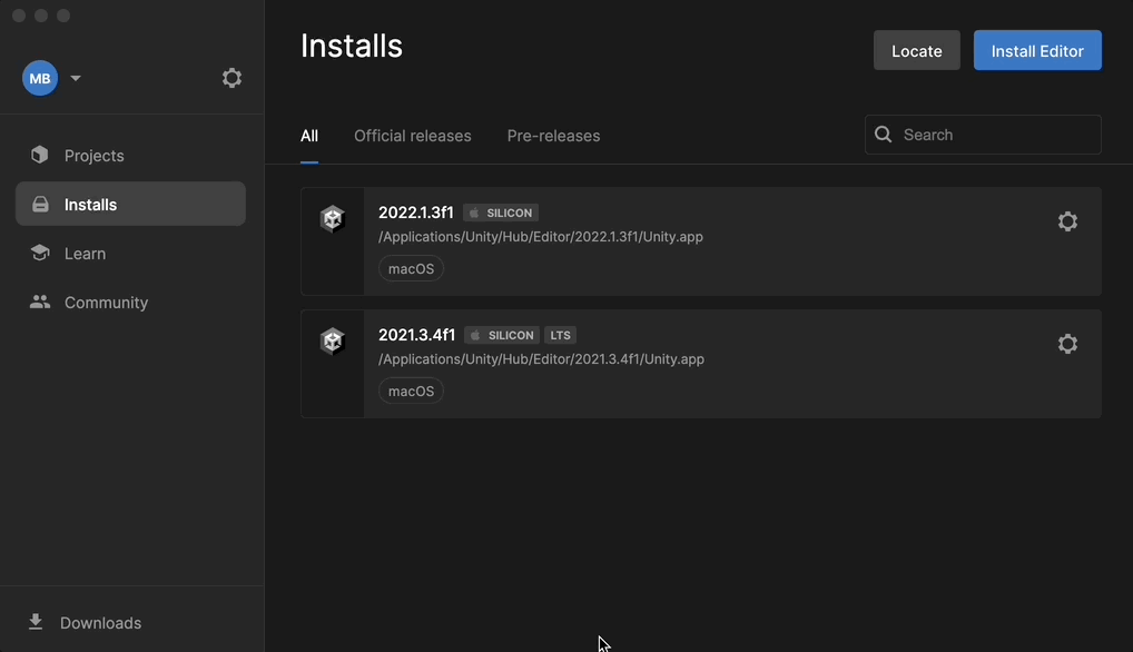 1. In the Installs tab of Unity Hub, click the ⚙︎ icon in the Unity Editor.